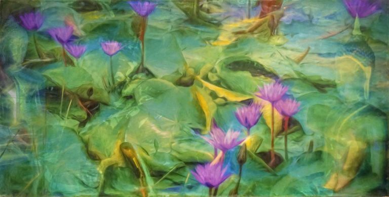 Purple Lotus – Hybrid photo paint encaustic on panel 12″ x 24″