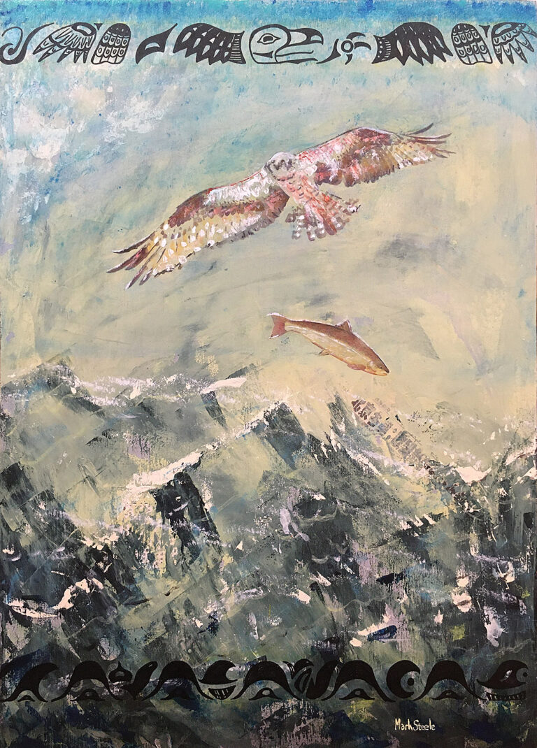 Hawk & Salmon – Acrylic on panel 43″ x 30″