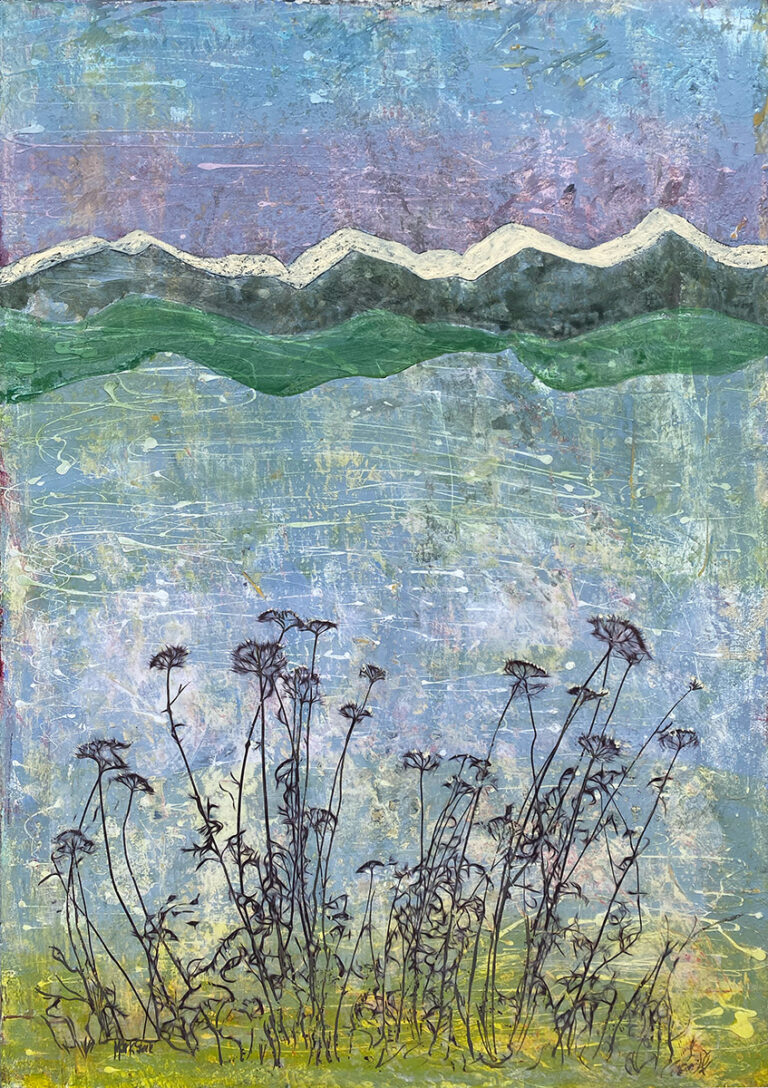 Yarrow and Mountains – Acrylic on panel 43″ x 30″